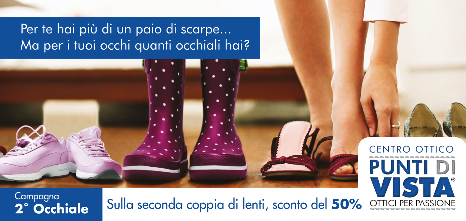 Per te hai più di un paio di scarpe..Ma per i tuoi occhi quanti occhiali hai?Campagna II° occhiale. Sconto sulla seconda coppia di lenti del 50%Avere più di un paio di occhiali non è un vezzo ma una esigenza. Quello da lontano, quello da sole, il progressivo e tanti altri per i tuoi occhi.Chiedi info al nostro personale